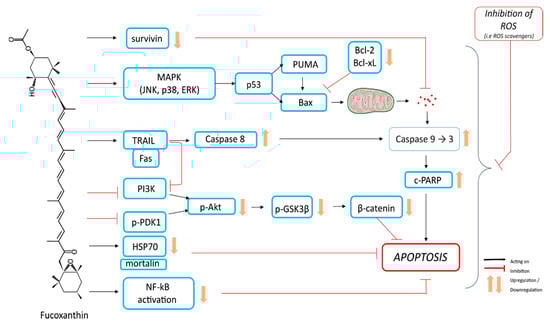 Results consistent with the data described above were obtained using the human U87 glioma cell line [85]. In the human hepatocarcinoma HepG2 cell line, apoptosis induction by fucoxanthin was correlated to a decreased expression of genes coding antioxidant enzymes superoxide dismutase (SOD1, SOD2) and catalase (CAT) and downregulation of signaling pathways (AKT, JNK, ERK1/2) [69]. The involvement of ROS in fucoxanthin-induced apoptosis was also reported for HL-60 leukemia and fucoxanthin-induced cytotoxicity, and apoptosis was suppressed by the ROS scavenger N-acetylcysteine (NAC) [25]. In HL-60 cells, fucoxanthin induced the cleavage of caspase-3, caspase-7, and PARP, and a decrease of the apoptosis inhibitor Bcl-xL. Moreover, the pre-treatment of cells with NAC prevented these effects of fucoxanthin [25]. In accordance, fucoxanthin increased the apoptosis in human cervical cancer cells, namely HeLa, SiHa, and CaSki cell lines, by targeting the PI3K/Akt/nuclear factor-kappa B (NF-κB) signaling pathway [83]. Fucoxanthin was also shown to synergize with tumor necrosis factor-related apoptosis-inducing ligand (TRAIL) to induce apoptosis in human cervical cancer cells [83].