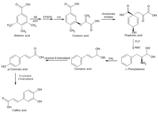 CA, 3-(3,4-dihydroxyphenyl)-2-propenoic acid, has a phenylpropanoid structure (C6-C3) with a 3,4-dihydroxylated aromatic ring attached to a carboxylic acid by the trans-ethylene bond [20,21]. The biosynthesis of this compound in plants takes place on the endogenous shichymate pathway which is responsible for the production of aromatic amino acids [22,23]. The reaction begins with the chemical acid and undergoes three enzymatic reactions: the first is a phosphorylation mediated by the enzyme schymatokinase, followed by the conjugation of a molecule of phosphenolpyruvate, mediated by the enzyme 5-enolpyruvylchychimate-3-phosphate (EPSP) and, finally, by the enzyme chorismatase, which reaches one of the most important intermediate metabolites of this pathway, i.e., chorismic acid [20,21,22,23,24]. It is converted to prefenic acid from chorismic acid (a precursor of L-phenylalanine) under the action of chorismate mutase. L-phenylalanine formation is mediated by pyridoxal 5-phosphate (PLP) as a coenzyme in the deamination process and nicotinamide adenine dinucleotide (NAD) responsible for electron transfer [20,24]. Deamination of L-phenylalanine by phenylalanine ammonium lyase (PAL) leads to the formation of cinnamic acid which is converted to p-coumaric acid using the enzyme cinnamate-4-hydroxylase (C4H) and finally to CA by the enzyme 4-coumarin 3-hydroxylase (C3H) [20]. The biosynthesis of the CA is presented in Figure 1.