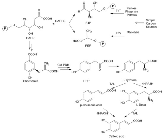 Proposed caffeic acid (CA) biosynthetic pathway. Native tyrosine biosynthetic pathway in E. coli and the artificial dual pathway mediated by 4HPA3H and TAL for CA biosynthesis from tyrosine. PPS: phosphoenolpyruvate synthase; TKT: transketolase; CM-PDH: chorismate mutase-prephenate dehydrogenase; DAHPS: 3-deoxy-D-arabino-heptulosonate-7-phosphate synthase; 4HPA3H: 4-hydroxyphenylacetate 3-hydroxylase; TAL: tyrosine ammonia lyase; E4P: D-erythrose-4-phosphate; PEP: phosphoenolpyruvate; HPP: 4-hydroxyphenylpyruvate [23].