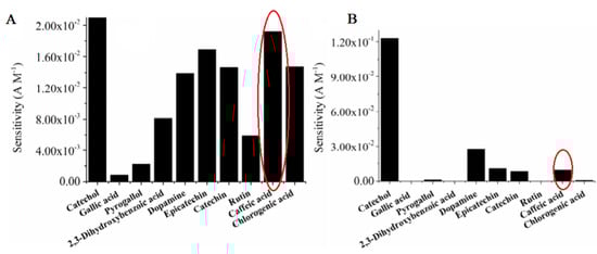 Sensitivity of Lacc-(A) and Tyr-(B) based biosensors to tested analyzes [90]. In red elipses are highlighted the results obtained in the case of the CA detection. Reprinted with the permission of the publisher.