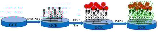 The sandwich structure of the biosensor PANI/Tyr-SWCNTs/GCE [95]. Reprinted with the permission of the publisher.