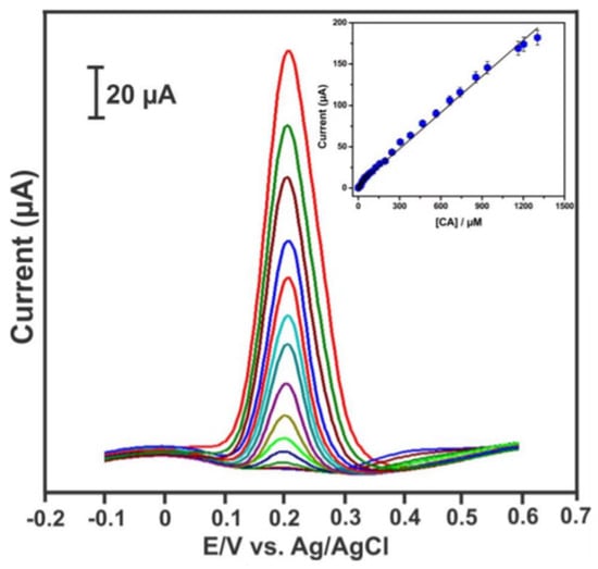 DPV response of the modified Au/PdNPs-GRF/GCE electrode for different CA concentrations from 0.03 to 938.97 μM at pH 7.0. Inset is linear plot for DPV current response vs. [CA] [70]. Reprinted with the permission of the publisher.