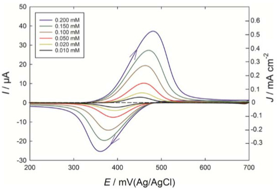 Cyclic voltammograms at a PEDOT electrode of phenolic standards in the concentration range from 0.01 to 0.20 mM, dissolved in the pH 3.6 model wine solution: (a) CA taken to 700 mV. [156].