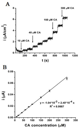 Such a method was addressed in a recent study for the development of a tyrosinase and PEDOT-based biosensor. The poly (3,4-ethylenedioxythiophene)-tyrosinase/Sonogel-Carbon biosensor (PEDOT-Tyr/SNGC) was proposed for the analysis of beer and wine. In order to produce this biosensor, the method of electrodeposition with sinusoidal current superimposed over a constant direct current was used. This method ensures enzyme immobilization, a technique which generates a nanostructured surface. The biosensor was electrochemically characterized, by using cyclic voltammetry and electrochemical impedance spectroscopy. Chronoamperometry was used for quantitative determinations with the biosensor. Figure 7A shows the chronoamperogram obtained by adding different concentrations of CA (10–300 pM). The calibration curve was made from the chronoamperogram, by using the current increase with each addition of CA (Figure 7B). The limits of detection, quantification, and sensitivity for the PEDOT-Tyr/SNGC biosensor to CA were 4.33 pM, 14.43 pM and 2.40 × 10−4 µA·µM−1, respectively. Repeatability of the measurements was evaluated in the range of concentrations 10–300 µM, obtaining a relative value of the relative standard deviation (RSD) of 2.67% [161].