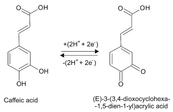 It can be observed that the redox process is reversible and involves the exchange of two protons and two electrons. CA is electrochemically oxidized to the o-quinone derivative, (E)-3-(3,4-dioxocyclohexa-1,5-dien-1-yl)acrylic acid. The process is reversible, the o-quinone derivative is reduced to caffeic acid. This reversible process is well evidenced when the detection technique is the cyclic voltammetry [70].