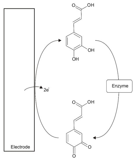 Tyrosinase and laccase, which are phenol oxidases, catalyze the oxidation of caffeic acid (o-diphenol) to o-quinone derivative. This o-quinone derivative is electrochemically reduced at the electrode surface. The reduction of quinone on electrodes generate the caffeic acid that is re-oxidized by the enzyme. In this way an amplification cycle of the current is generated. The increment of sensitivity depends on the nature of the electrode and on the nature of the analyte [91].