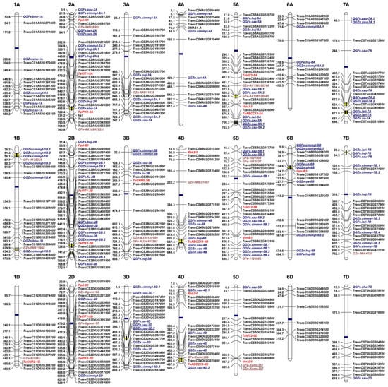 3.3. Genetic Loci Detected by Linkage Mapping and Association Mapping in Wheat