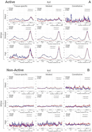 Then, along the length of promoter, we computed the profiles of the average numbers of resistant/sensitive nucleosome sites for Active and Non-Active genes and categorized them by RPKM value and BoE. Notably, these subsets revealed clear diversity in the nucleosome arrangement around TSS (Figure 2 and Supplementary Figure S4). We concluded that the regular nucleosome positioning is the specific feature of the Active chromatin state.