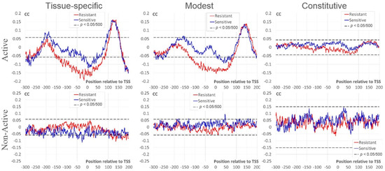 - strongly significant negative CC for resistant nucleosomal sites around TSS [−120; +80] for tissue-specific and modest; moderate negative CC for sensitive nucleosomal sites for tissue-specific [−30; +50] and modest [+10; +70];