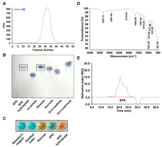 To identify EPS as a homogeneous polysaccharide, EPS (30 mg/mL) was purified by size exclusion chromatography on a HiLoad® 16/600 Superdex 200 pg column (GE Healthcare, Chicago, IL, USA) with phosphate-buffered saline (PBS), and it was analyzed via the ÄKTA FPLC system (GE Healthcare).