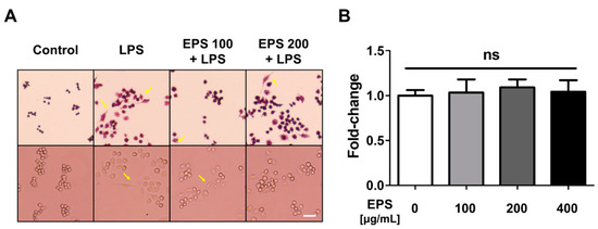 The purified EPS could alleviate the morphological changes induced by LPS in RAW 264.7 cells. (A) Cells pretreated with EPS were cultured with fresh media containing LPS and stained with crystal violet. EPS pretreatment inhibited the LPS-induced morphological changes, as indicated by the yellow arrow. (B) EPS treatment did not have any effect upon cell viability after 1 day. Scale bar = 50 μm; ns, not significant.