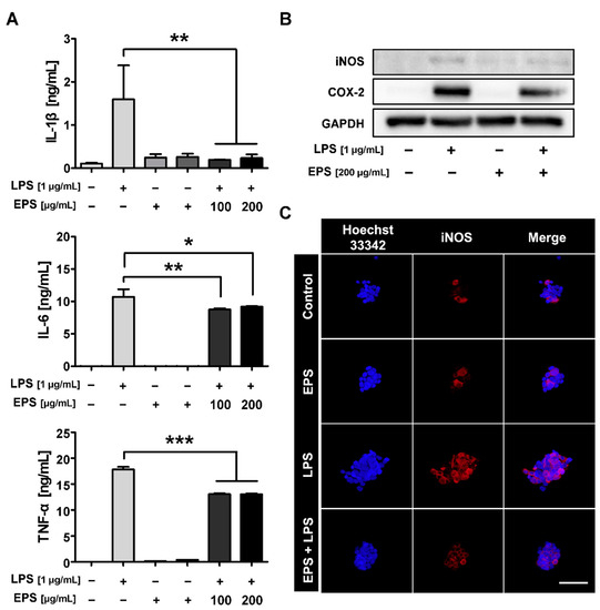 EPS inhibited the LPS-induced inflammatory response in RAW 264.7 cells. (A) Cells were pretreated with EPS, and proinflammatory cytokines were quantified using ELISA; EPS attenuated the expression levels of IL-6, TNF-α, and interleukin-1β (IL-1β). (B) EPS suppressed the expression of cyclooxygenase-2 (COX-2) and inducible nitric oxide synthase (iNOS) proteins induced by LPS in RAW 264.7 cells. (C) The expression of iNOS stimulated by LPS was inhibited in EPS-pretreated RAW 264.7 cells as shown by immunofluorescence (IF) assay. * p < 0.05, ** p < 0.01, and *** p < 0.001 versus the LPS-treated group. Scale bar = 50 μm.