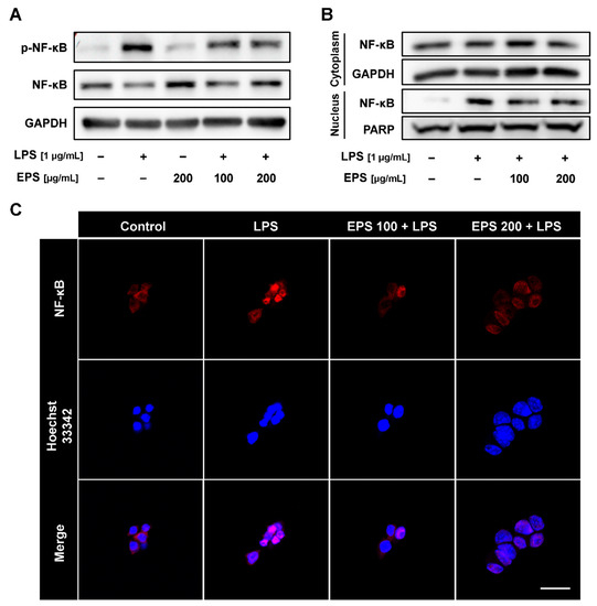 To examine whether EPS inhibited phosphorylation and translocation to the nucleus of NF-κB following induction by LPS, the inflammatory response was stimulated by LPS in RAW 264.7 cells pretreated with EPS followed by an analysis of the expression level of NF-κB and localization of its phosphorylated form. The p-NF-κB/NF-κB ratio was then decreased by EPS pretreatment (Figure 5A). EPS itself did not promote the phosphorylation of NF-κB. As shown in Figure 5B, EPS suppressed LPS-induced nuclear translocation of NF-κB at all concentrations. Consistently, while translocation of NF-κB into the nucleus was induced by LPS, this was reduced by pretreatment of EPS in RAW 264.7 cells (Figure 5C).