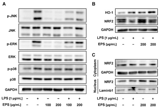 The MAPK and NRF2/HO-1 pathways are identified as major regulators of the inflammatory response in mouse macrophages. To determine whether EPS has any effects on the MAPK pathway, phosphorylation of MAPK family proteins (JNK, ERK, and p38) was analyzed. EPS significantly inhibited the LPS-induced phosphorylation of JNK and ERK even at 100 μg/mL of EPS (Figure 6A). Phosphorylation of p38 resulting from LPS was suppressed in the cells treated with EPS at a concentration of 200 μg/mL. To confirm that the anti-inflammatory effects of EPS were mediated through the NRF2/HO-1 pathway, the protein expression levels of known anti-oxidant markers were identified. The expression levels of both HO-1 and NFR2 were then increased with or without LPS (Figure 6B). Consistent with the previous results, the translocation of NRF2 into the nucleus was also increased following EPS exposure (Figure 6C). In summary, EPS inhibited the phosphorylation of MAPK family proteins and enhanced the expression of NRF2/HO-1 in LPS-induced RAW 264.7 cells.