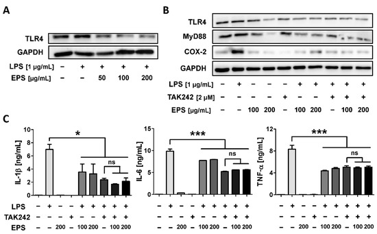 EPS inhibited LPS-induced inflammatory response through Toll-like receptor 4 (TLR4) pathway in RAW 264.7 cells. (A) EPS inhibited the expression of TLR4 induced by LPS. (B) The expression levels of TLR4, Myeloid differentiation factor (MyD88), and COX-2 in the EPS-pretreated groups were analyzed using TAK-242; expression levels of TLR4 and MyD88 were inhibited by EPS in LPS-treated groups similar to the TAK-242-treated group; COX-2 was inhibited by TAK-242 and EPS to a similar level. (C) EPS and TAK-242 suppressed the expression of proinflammatory cytokines induced by LPS. However, there was no synergetic effect observed when EPS and TAK-242 were simultaneously administered to RAW 264.7 cells. * p < 0.05 and *** p < 0.001 versus the LPS-treated group; ns, not significant.
