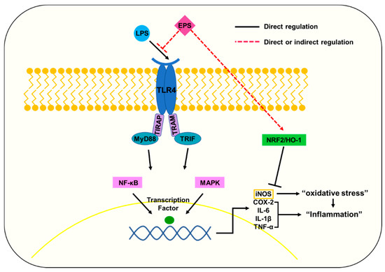 When LPS binds to TLR4 in the cell membrane, the resulting complex can lead to the activation of adaptor proteins including MyD88 and TIR-domain-containing adapter-inducing interferon-β (TRIF). NF-κB is phosphorylated and translocated into the nucleus by adaptor proteins. MyD88 and TRIF phosphorylate members of the MAPK pathway, and the MAPK family protein translocates transcription factors related to the inflammatory response into the nucleus. These translocated factors upregulate the expression of proinflammatory cytokines and COX-2. However, EPS could inhibit the LPS-induced inflammatory response by downregulating TLR4. EPS also repressed the expression of iNOS, which led to oxidative stress by upregulating the NRF2/HO-1 pathways. Nevertheless, more research is required to elucidate how EPS regulates the expression of TLR4.