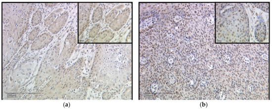 Immunohistochemical staining of LDOC1 in vulvar carcinoma tissue. Representative photomicrographs are presented (10× and 25× magnification): (a) cytoplasmatic expression of LDOC1 in vulvar carcinoma; (b) nuclear expression of LDOC1 in vulvar carcinoma.