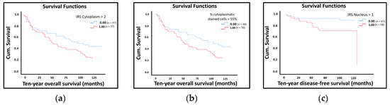 The Kaplan–Meier estimates show that high LDOC1 expression leads to decreased ten-year overall survival/disease-free survival. The red curves represent the event specified in the top-right corner of each graph, while the blue curves represent the opposing event: (a) Kaplan–Meier survival univariate analysis for the status cytoplasmatic IRS > 2. Positive expression of LDOC1 in the cytoplasm significantly reduced ten-year overall survival (p = 0.049); (b) Kaplan–Meier survival univariate analysis for the status cytoplasmatic stained cells >55%. Expression of LDOC1 in 55% of the cytoplasm positively stained cells were significantly related to a worse ten-year overall survival (p = 0.046); (c) Kaplan–Meier survival univariate analysis for the status nuclear IRS > 1. Positive nuclear staining of LDOC1 showed a significant negative influence on ten-year disease-free survival (p = 0.031).