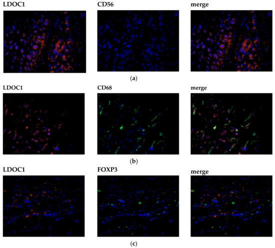 In 96% of the specimens, LDOC1-positive immune cells could be detected. There was no significant influence of LDOC1-positive immune cells on clinicopathological parameters nor patients’ survival. In order to characterize the immune cells subpopulations, immunofluorescence double staining for LDOC1 and three markers for leucocyte subpopulations, CD56, CD68 and FOXP3, was carried out. In Figure 4, representative photomicrographs of the immunofluorescence double staining are presented. The left column shows LDOC1-positive cells (red), the column in the center shows the marked immune cell (green), and the right column merges the two expression patterns to identify a possible co-expression of LDOC1 (red) and stained immune cells (green). Double staining of LDOC1 and CD56 as a marker for natural killer cells showed no result (Figure 4a). No CD56-positive immune cells could be detected in the tumor bed infiltrated by immune cells as displayed in the center column of Figure 4a, whereas double staining of LDOC1 and CD68 (Figure 4b) as a marker for macrophages as well as FOXP3 (Figure 4c) as a marker for regulatory T cells showed positive results, as illustrated in the Figure 4b,c by green stained cells. The immune cell subpopulations were quantified by counting CD56-, CD68-, and FOXP3-positive cells per field of view (20x magnification). Most infiltrating cells were CD68-positive macrophages, followed by FOXP3-positive regulatory T cells.