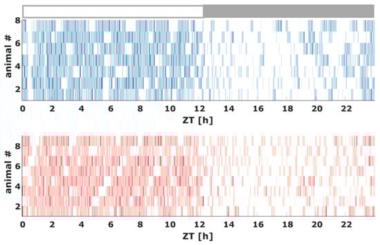 Hypnogram of the AC (top) and AD (bottom) animals over the entire 24 h observation period derived from the 10 s scoring with lights turned off after the 12th hour. White indicates WAKE, light blue (AC) or light red (AD) indicates NREM, and blue (AC) or red (AB) indicates REM. The x-axis is Zeitgeber time (ZT) with ZT = 0 indicating the start of the inactive “lights-on” phase at 7 am. The grey rectangle indicates the active “lights-off” phase. #: number