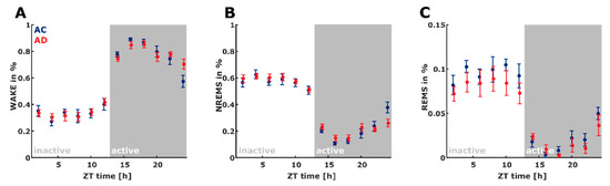 There were no significant differences in (A) WAKE (FWAKE = 0.03, p = 0.857), (B) NREM sleep (FNREM = 0.41, p = 0.522), and (C) REM sleep (FREM = 3.00, p = 0.085) between the control (AC, blue, n = 7) and Alzheimer’s (AD, red, n = 8) animals. The distribution plots were derived from the 10 s scoring. The x-axis is Zeitgeber time (ZT) with ZT = 0 indicating the start of the inactive “lights-on” phase at 7 am. NREMS: NREM sleep; REMS: REM Sleep.
