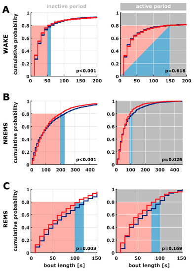Cumulative probability plots of the different vigilance states derived from the 10 s scoring in logarithmic presentation of the inactive (left) and active (right) periods for (A) WAKE, (B) NREM sleep (NREMS), and (C) REM sleep (REMS). Blue: AC group, red: AD group. The bout lengths of WAKE (inactive) and NREM sleep (active and inactive) are significantly different among the groups. Except for the WAKE bouts in the active phase, the bout length distributions are significantly different. In general, the AC graphs are approaching cumulative probability 1 more gradually indicating a more uniform distribution of bout lengths than in the AD rats. The red and blue areas indicate the bout duration corridor; where 80% of the bouts were less than that time epoch.