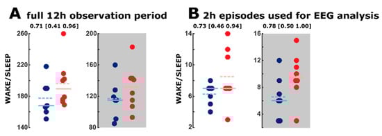 Dot plots inclusive mean (dashed line) and median (solid line) of transitions between WAKE and SLEEP of the AC group (n = 7, blue) and the AD (n = 8, red) group. (A) The plot represents the transition for the entire 12 h of the active or inactive period, scored in 10 s epochs. For the inactive period, we derived AUC values reflecting a fair effect. For the WAKE to SLEEP transition, AUC was 0.71 (95% CI: 0.41–0.96). (B) For the 2 h episodes (scored in 4 s epochs) used for quantitative EEG analysis, the AD animals showed a higher number of transitions as well.