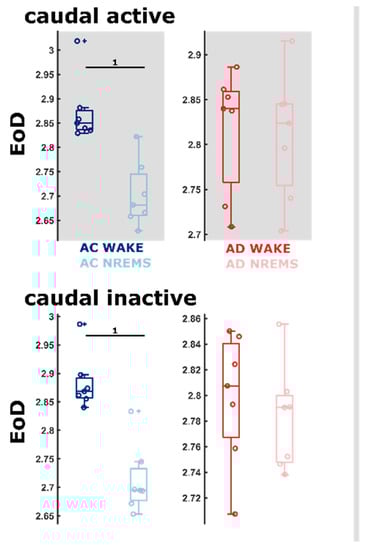 In order to evaluate the significance of the increase in relative power in the higher frequency bands for AD animals, we examined the complexity of the qEEG information. Therefore, we used the entropy of difference (EoD) that is based on evaluating the sign of the difference between neighboring values. The primary finding is a significant change in the EoD with the vigilance state, i.e., between WAKE and NREM sleep in the AC animals that is absent in the AD animals. Figure 6 shows the corresponding details for the EoD (τ = 1) of the caudal EEG and Supplemental Figure S2—for the EoD (τ = 1) for the rostral EEG. Further, when comparing the AC and AD animals at respective vigilance states, the EoD (τ = 1) of the AD group is significantly (rostral: 0.78 [0.45–1]; caudal: 0.96 [0.81–1]) lower, indicating a reduced complexity in the WAKE EEG that may correspond with decreased information content. During NREM sleep, the information content as evaluated by EoD (τ = 1) was significantly (e.g., AUC = 0.12 [0–0.35] for the rostral EEG during the active phase) higher in the AD rats (Table 1). During REM sleep, we only observed effects in the caudal EEG with a significantly higher EoD (AUC = 0.86 [0.57–1]; caudal, active phase). The detailed results are presented in Supplemental Figure S3 (rostral) and Supplemental Figure S4 (caudal). Supplemental Table S2 contains detailed statistical results.