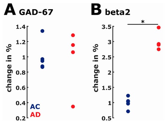 Dot plots of the relative change in protein expression normalized to beta-actin expression. (A) GAD-67 expression was not different between the groups indicating no significant change (AUC: 0.60, 95% CI: 0.2 to 1) in the amount of GABA produced; note that the highest value in the AC group and the lowest value in the AD group could be considered outliers as evaluated by the Grubbs’s test. (B) GABAAR β2 expression was significantly (AUC = 1) higher in the AD group. This indicates an increased number of GABAAR in the AD group. * indicates significance