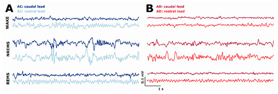 Exemplary EEG raw traces for the animals from (A) the age-matched controls and (B) the AD rats at different vigilance states—WAKE, NREM sleep, and REM sleep—that were recorded from the caudal or rostral EEG lead. NREMS: NREM sleep; REMS: REM sleep.