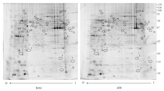 2-DE image analysis was performed using the Proteomweaver 4.0 software. The analysis process was carried out by matching all gels from seven RAOM and seven ATH. The Proteomweaver 4.0 algorithm matched all of the gels to find quantitative differences. Differences were considered significant when the ratio of the mean percentage relative volume (%V) (%V = V (single spot)/V (total spot)) showed a fold change of at least 1.5 and satisfied the non-parametric Wilcoxon test (p < 0.05). Fold change was calculated as the ratio between the mean %V of RAOM and ATH.