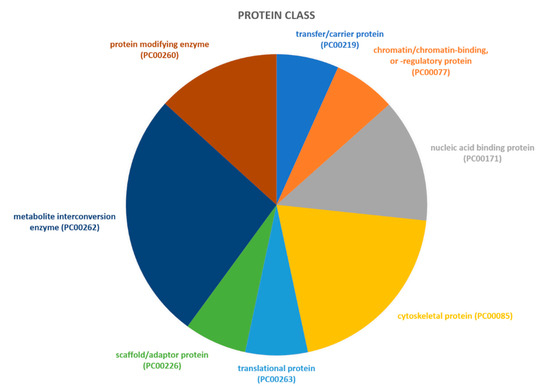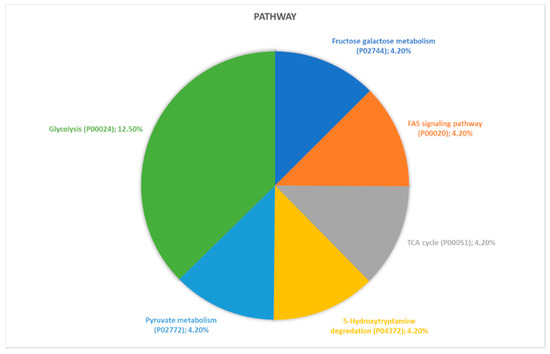 Proteins identified through proteomic analysis were then subjected to Protein Analysis Through Evolutionary Relationships (PANTHER) classification, which categorized these proteins into groups according to their biological processes, molecular function, protein class and pathway. In terms of biological processes (Figure 2), the proteins were grouped into four main categories: metabolic processes, cellular processes, cellular component organization or biogenesis, and localization. Cellular process was the category including the majority of proteins (twelve, specifically Aconitase 2 (ACO2), Albumin (ALB), Aldolase, Fructose-Bisphosphate C (ALDOC), Cyclase Associated Actin Cytoskeleton Regulatory Protein 1 (CAP1), Capping Actin Protein, Gelsolin Like (CAPG), Coronin 1A (CORO1A), Eukaryotic Translation Elongation Factor 1 Alpha 1 (EEF1A1), H4 Clustered Histone 1 (H4C1), Hemoglobin Subunit Beta (HBB), Pyruvate Kinase M1/2 (PKM), Proteasome 26S Subunit ATPase 6 (PSMC6), Valosin Containing Protein (VCP)) found in proteomic analysis. For the molecular function category (Figure 3), proteins were grouped into: catalytic activity, binding, transporter activity, and translation regulator activity, with most proteins pertaining to the binding group. For the protein class category (Figure 4), proteins were grouped in: cytoskeletal protein, metabolite interconversion enzyme, nucleic acid binding protein, and protein-modifying enzyme. Finally, regarding pathway classification, proteins were grouped into six pathways (Figure 5). Five of these (5-Hydroxytryptamine degradation, Fructose galactose metabolism, Glycolysis, Pyruvate metabolism, TCA cycle) are correlated with sugar, acid citric, and serotonin metabolism.