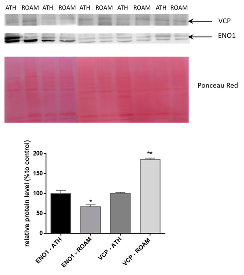 Representative Western blotting analysis of VCP and ENO1 in ATH and RAOM. The intensities of the immunostained bands were normalized with the protein intensities measured by Red Ponceau from the same blot. The bar graph shows the relative quantitation (band density) of VCP and ENO1 in ATH and RAOM. Results are shown as a histogram (* indicates p < 0.05, while ** indicates p < 0.01 statistical difference) and each bar represents mean ± standard error.
