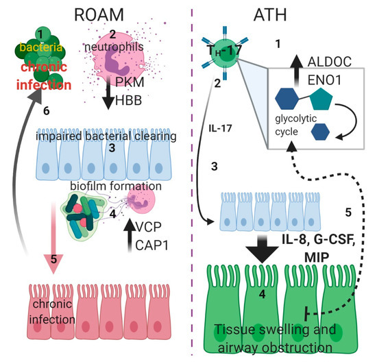 Schematic diagram displaying putative pathogenic mechanisms In ROAM (left side): bacterial infections (1) triggers neutrophils degranulation (2), but this is not effective due to lower PKM and HBB levels (black arrow downwards). Defective bacterial clearing (3) causes chronic infection (through formation of biofilm) in the median ear, with a consequent increase of NETs formation (4), due to higher proteasome activity provoked by increased VCP and CAP1 levels (black arrow upwards). Chronic bacterial infection of ear tissue (5) (red) establishes a milieu in which recurrent infections (6) are facilitated. In ATH (right side), TH-17 cells are activated (1) and switch to glycolytic metabolism (gray square), with increased levels of ALDOC and ENO1 (black arrow upwards). Activation of these cells causes increasing Interleukin-17 (IL-17) (2) production. This cytokine (3) could drive epithelial expression of granulopoietic and chemotactic factors such as Interleukin-8 (IL-8), Granulocyte Colony-Stimulating Factor (G-CSF) and Macrophage Inflammatory Proteins (MIP) (big arrow downwards) that could induce swelling of adenoidal tissue (4) (green), followed by upper airway obstruction. The imperfect oxygen intake could then trigger a self-sustained cycle (5) (dotted arrow), inducing furthermore a switch toward glycolytic metabolism (created with BioRender.com).