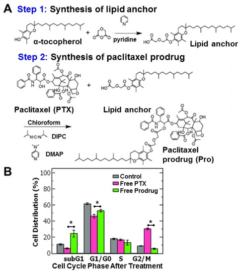 (A) Schematic of the two-step synthesis of the paclitaxel-prodrug with α-tocopherol as the lipid anchor. In the first step, the tocopherol lipid anchor is synthesized, and in the second step paclitaxel (PTX) is conjugated to the lipid anchor to form the prodrug (Pro). (B) Cell cycle analysis of ovarian cancer cell line OVCA-432 using flow cytometry of (grey) untreated cells, control, and cells treated with either (pink) free paclitaxel or (green) free paclitaxel prodrug (n = 3). Analysis with a t-test found a significant difference between free paclitaxel and free prodrug was when comparing the subG1 phase (p = 0.018), G1/G0 phase (p = 0.011), G2/M phase (p = 0.00005) where the cell cycle is comprised of the: G1 = growth phase 1, S = DNA synthesis phase, G2 = growth phase 2, M = mitosis, and G0 = rest phase.