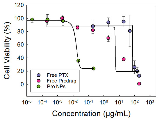 The focus of this work was evaluating the potency of the prodrug and prodrug nanoparticle formulations. In Figure 4, we compare the dose response of cells treated PTX, prodrug or with nanoparticles loaded prodrug. The prodrug was more potent than paclitaxel; the dose response curve shifted to the left. Synthesizing the prodrug enhanced the potency as indicated by the 8-fold decrease in IC50 concentration (Table 4).