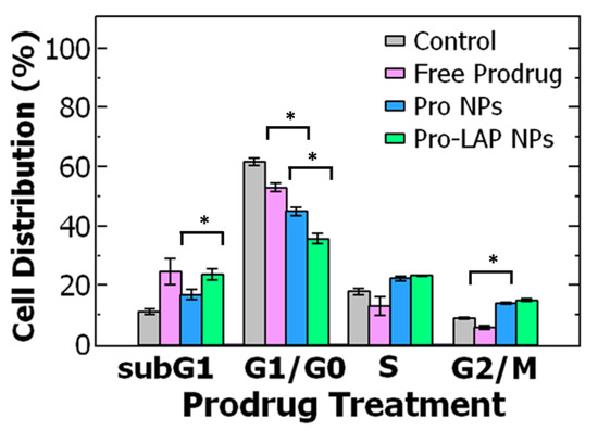 Further, we examined the effect of treatment with the co-loaded nanoparticles on cell cycle distribution. The Pro-LAP NPs exhibited the greatest reduction in the proportion of cells in the G1/G0 phase compared to both free prodrug and Pro NPs. The cells were redistributed among the other three phases. Particularly, there was a significant increase in cells in the subG1 phase from ~17% when treated with Pro NPs to ~24% when treated with Pro-LAP NPs (p = 0.012). The proportion of cells in the G2/M phase was equivalent between the two treatments (Figure 5). The greater portion of cells in the subG1 phase with Pro-LAP NPs could be attributed to the greater drug potency due to combination delivery as well as coordination between cell cycle arrest induced by the paclitaxel prodrug (G2/M arrest) and lapatinib (G1/G0 arrest) [16,62].