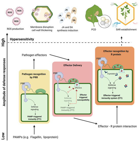 The PTI model suggests that plants generally exhibit resistance against a broad spectrum of microbes. However, some pathogens have developed effectors to interfere with the PTI in plants, which is known as effector-triggered susceptibility. From lower plants to higher, all plants face pathogen attacks. R genes are found from streptophyte algae to land plants [76]. However, it has been suggested that plants acquire diverse molecules such as PRRs to recognize various pathogens along evolution [77]. Some plants have evolved specific recognition mechanisms to detect and neutralize pathogenic effectors, hence achieving effector-triggered immunity (ETI) [78]. Such a recognition mechanism resembles the “gene-for-gene relationship” mentioned above [67]. PTI and ETI are integrated to explain the defense responses described as the “zigzag” model [79]. The responses of PTI and ETI eventually lead to systemic acquired resistance (SAR) [79]. Usually accompanied by programmed cell death (PCD) at the site of infection to restrict the spread of pathogens, ETI has been known as a boosted PTI response [79]. PCD is a part of hypersensitive response (HR), which occurs at the site of infection for restricting the spread of pathogens [79]. The production of ROS is a feature of HR. ROS cause the disruption of membrane, the thickening of the cell wall by crosslinking cell wall substances, the induction of jasmonic acid (JA) and salicylic acid (SA) syntheses, and eventually, PCD at the site of infection [80]. The production of ROS also triggers a signaling network to mediate the establishment of SAR [81]. SAR is not confined to the infected area but develops throughout the whole plant [82]. SAR enables the plant to be resistant to a broad spectrum of pathogens including pathogens which are originally infectious to the plant [82]. SAR is accomplished by the induction of pathogenesis-related (PR) proteins which have antimicrobial functions [83]. The overview of the defense response is illustrated in Figure 1.