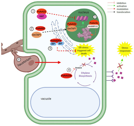 Representation of a selection of recently reported virulence peptides involved in the infection of plant cells by P. sojae. This figure shows a snapshot of the widespread metabolic changes induced by this oomycete as a result of the infection. (0) The haustorium penetrates soybean tissues and secretes effector peptides close to and into the plant cells [44]. (1) PsAvh23 binds to the regulatory subunit of the H3K9 histone acetyltransferase (HAT), preventing it from associating with the catalytic subunit and therefore, suppressing defense gene activation [15]. (2) PsAvh52 translocates the putative transacetylase protein GmTAP1 to the nucleus, leading to the acetylation of core histones and the upregulation of plant susceptibility genes [115]. (3) PsAvr3c stabilizes the spliceosome-associated protein GmSKRP1/2, causing changes in host pre-mRNA splicing, thus impairing plant immunity [117]. (4) PsAvh238 interacts with a type-2 aminocyclopropane-1-carboxylate synthase (GmACS), a key enzyme in ethylene biosynthesis, which disrupts ethylene signaling and therefore, impairs pathogen-induced stress responses in the plant host [120]. (5) PsAvh262 suppresses ER stress-triggered cell death by stabilizing luminal binding immunoglobulin proteins (BiPs), and therefore, promoting infection [121].