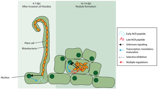 The secretion mechanism and modes of action of nodule-specific cysteine-rich (NCR) peptides. NCR peptides secreted at 4–7 days post inoculation (dpi) with rhizobia and at 10–14 dpi are classified as early and late NCR peptides, respectively [145]. The host root cells recognize unknown signals from the rhizobia and secrete NCR peptides, which may selectively inhibit incompatible rhizobia [139] and mediate bacteroid formation [137,138].