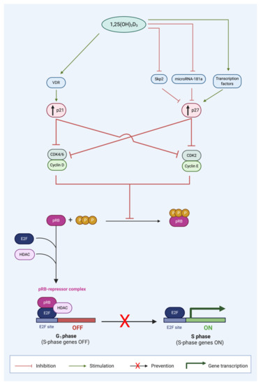 Calcitriol upregulates p21 and p27 expression in the G1 phase and prevents cell cycle progression to the S phase [3]. Calcitriol (1,25(OH)2D3) increases the expression of CDK inhibitors (CDKIs), p21 and p27, by numerous mechanisms. p21 expression is increased by stimulation of liganded VDR signaling. p27 expression is increased by signaling transcription factors; inhibition of p27 protein degradation by S-phase kinase-associated protein 2 (Skp2); and enhanced p27 translation by abrogated microRNA-181a expression. The collective outcome of the increased CDKI expression is suppression of cyclin-CDK complex formation, which inhibits the formation of hyperphosphorylated retinoblastoma protein (pRB). The unphosphorylated pRB thus is able to form a repressor complex with histone deacetylase (HDAC) and E2F transcription factor (E2F), which prevents the progression of cancer cells in the G1 phase to the S phase, inhibiting S phase gene expression, and thus causing G0/G1 cell cycle arrest. (Source: personal collection).