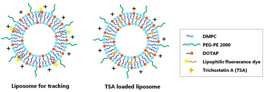 Schematic illustration of liposome for tracking and TSA-loaded liposome. Two liposome particles were synthesized. (Left) The liposome was synthesized for the purpose of tracking the location of the drug when it was administered to the vitreous cavity. (Right) The liposome was loaded with TSA and synthesized for the purpose of treatment. DMPC = 1,2-dimyristoyl-sn-glycero-3-phosphocholine; PEG 2000-PE = 1,2-distearoyl-sn-glycero-3-phosphoethanolamine-N-[methoxy(polyethylene glycol)-2000]; DOTAP = 1,2-dioleoyl-3-trimethylammonium propane.