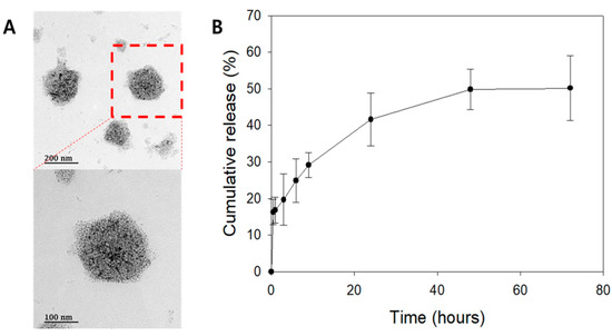 Liposomes were produced as illustrated in Figure 2. The mean diameter of bare liposomes was 118.30 ± 45.06 nm, with a polydispersity index of 0.369 and zeta potential of 20.70 ± 6.25 mV. After loading TSA, the mean diameter of liposomes was 155.20 ± 57.37 nm, with a polydispersity index of 0.335 and zeta potential of 15.20 ± 5.95 mV. Transmission electron microscopy (TEM) images showed spherical liposomes that were predominantly unilamellar (Figure 3A). To maintain the liposome shape, TEM images were taken after loading commercialized dextran-coated iron oxide nanoparticles. The encapsulation efficacy (EE%) of liposomes, normalized to the lipid concentration, was 21.96% and corresponded to approximately 17.8 nM of TSA. The cumulative release profile of TSA for the TSA-loaded liposomes showed a 50% release for 72 h with initial 16% burst release (Figure 3B).