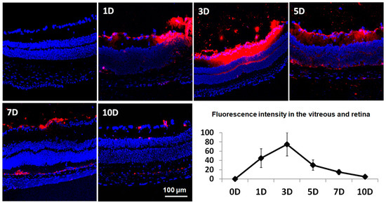 Figure 4 demonstrates the distribution of liposomes at 1, 3, 5, 7, and 10 days postinjection. The vitreous humor consists of hyaluronan, an anionic hydrophilic polymer with a high molecular weight, and collagen fibers that provide strength and resistance to tractional forces. As previously reported, polyethylene glycol (PEG)-ylated liposomes with moderate positive surface charge showed broad distribution throughout the vitreous humor, reaching the ganglion cell layer of the inner retina. The fluorescence intensity peaked at 3 days postinjection and declined gradually over a period of 10 days.