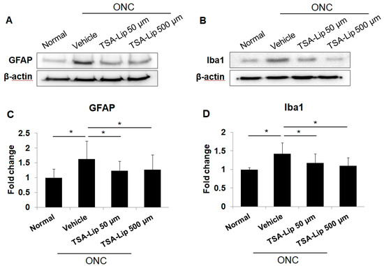 Effect of intravitreally injected TSA-loaded liposomes on gliosis in retina after optic nerve crush (ONC). The ONC procedure markedly increased GFAP (A,C) and Iba1 (B,D) protein expression in retinas at 3 days. The intravitreal injection of TSA-loaded liposomes significantly attenuated this response. The relative chemiluminescence intensity for each protein band was normalized using β-actin as a calibrator. TSA-Lip 50 µM = liposomes loaded with 50 µM TSA; TSA-Lip 500 µM = liposomes loaded with 500 µM TSA. Error bars represent the SD (n = 6 retinas per group); * p < 0.05; one-way ANOVA with post-hoc LSD test.