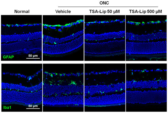 Immunohistochemical staining of GFAP and Iba1 in retinas at 7 days after ONC. (Upper) Sections from vehicle-injected retinas after ONC show increased GFAP activity on the RGC layer and the radial process of macroglial cells spanning the inner plexiform layer. The intravitreal injection of TSA-loaded liposomes significantly attenuated the GFAP activity in retinas after ONC. (Lower) Immunolabeling for Iba1 in retinal sections showed prominent activation of microglia in vehicle-injected retinas after ONC. This activation was ameliorated in the retinas injected with TSA-loaded liposomes. Images with lower magnification are presented in Supplementary Figure S2. TSA-Lip 50 µM = liposomes loaded with 50 µM TSA; TSA-Lip 500 µM = liposomes loaded with 500 µM TSA.