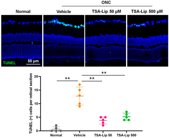 TUNEL staining was performed on retinal sections 7 days after ONC. Vehicle-injected retinas demonstrated significantly higher TUNEL-positive apoptotic cells in RGC layer after ONC (** p < 0.001, compared to the uninjured normal eyes). The intravitreal injection of TSA-loaded liposomes immediately after ONC injury, suppressed RGC apoptosis (** p < 0.001, compared to the vehicle group). There were no significant differences in TUNEL-positive apoptotic cells between the groups with 50 μM and 500 μM TSA-loaded liposomes. Images with lower magnification are presented in Supplementary Figure S3. TSA-Lip 50 µM = liposomes loaded with 50 µM TSA; TSA-Lip 500 µM = liposomes loaded with 500 µM TSA. All comparisons were performed using one-way ANOVA with post-hoc LSD test.