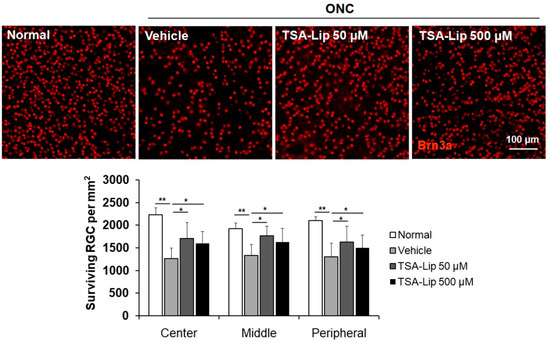 Effect of TSA-loaded liposomes on RGC survival after ONC. Retinal flat mounts are shown for the uninjured normal retinas, vehicle-injected retinas, and retinas injected with 50 μM and 500 μM TSA-loaded liposomes (n = 5 retinas per group). A quantitative analysis of RGC survival in center, middle, and peripheral zones of each retinal quadrant is also shown as a graph. TSA-Lip 50 µM = liposomes loaded with 50 µM TSA; TSA-Lip 500 µM = liposomes loaded with 500 µM TSA. Scale bar = 100 µm; ** p < 0.001, compared to the uninjured normal retina; * p < 0.05 compared to the vehicle-injected retina; one-way ANOVA with post-hoc LSD test.