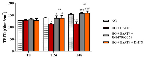 The activity of DHTS and JNJ47965567 as antagonists of HG + BzATP challenge was evaluated by measurements of TEER by using a Millicel-Electrical Resistance System (ERS2) (Merck, Millipore, Burlington, MA, USA) at different time points: 0 (T0), 1 (T24), and 2 (T48) days after treatment as previously described [33,85].
