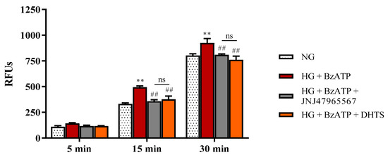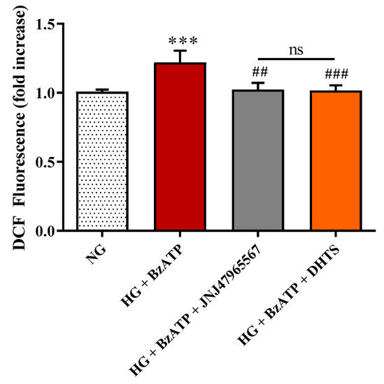 Intracellular ROS production in endothelial cells under our experimental conditions. NG = normal glucose condition (5 mM). HG = high glucose condition (40 mM). BzATP = 200 µM. JNJ47965567 = 100 nM. DHTS = 500 nM. Values are reported as means ± SD of three independent experiments. Statistical analysis was performed using one-way ANOVA with Tukey’s post-hoc analysis. *** p < 0.001 vs. NG. ## p < 0.01 vs. HG + BzATP. ### p < 0.001 vs. HG + BzATP. ns = not significant.